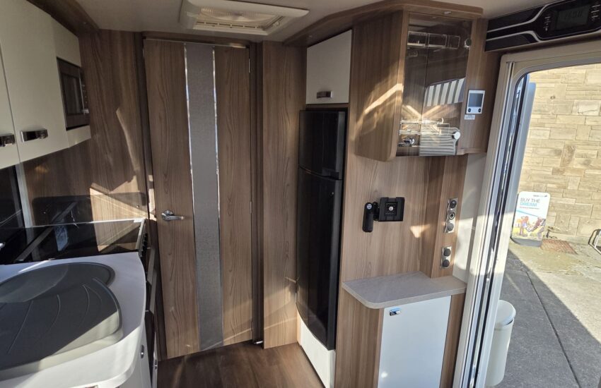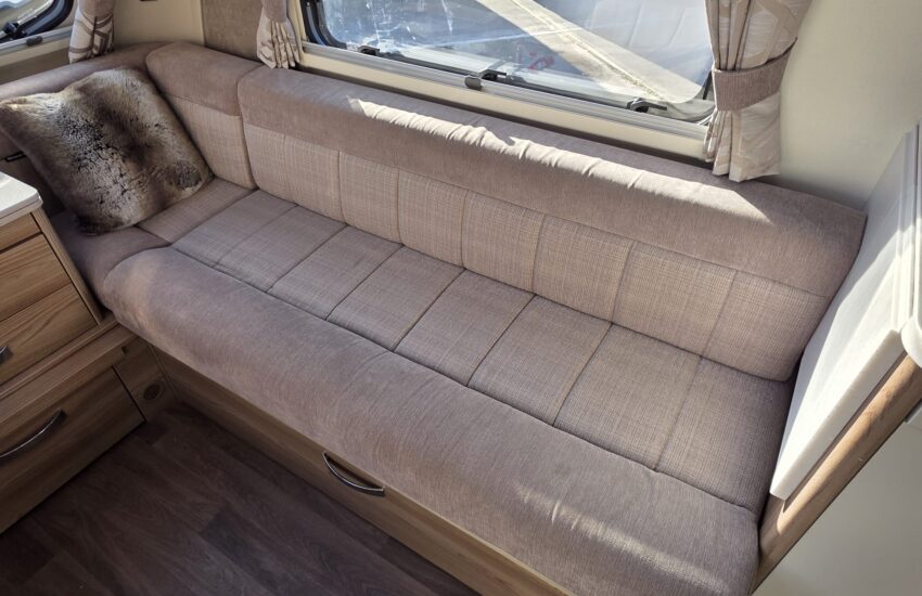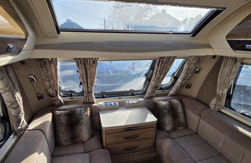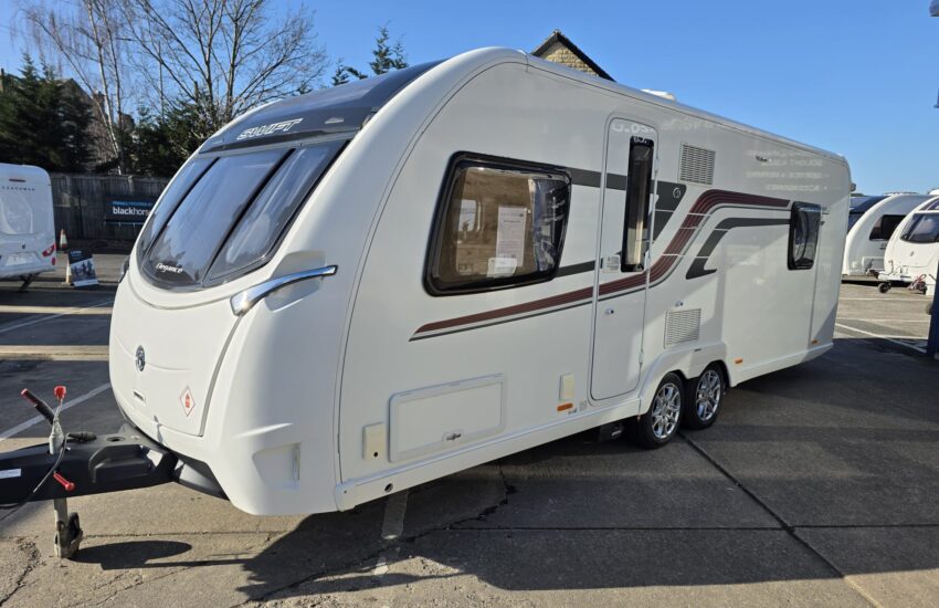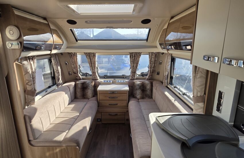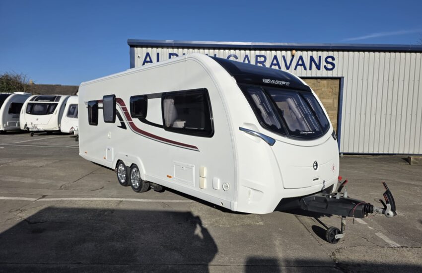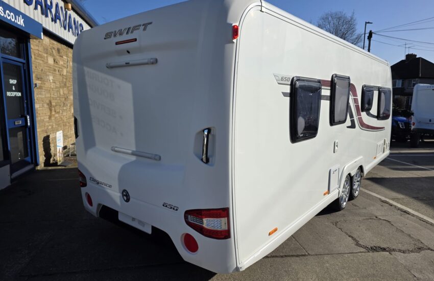 The Swift Elegance 650 2017 is a luxury twin-axle touring caravan from Swift’s flagship Elegance range. It’s designed as a high-spec “home-from-home” caravan with a fixed island bed and central washroom.