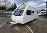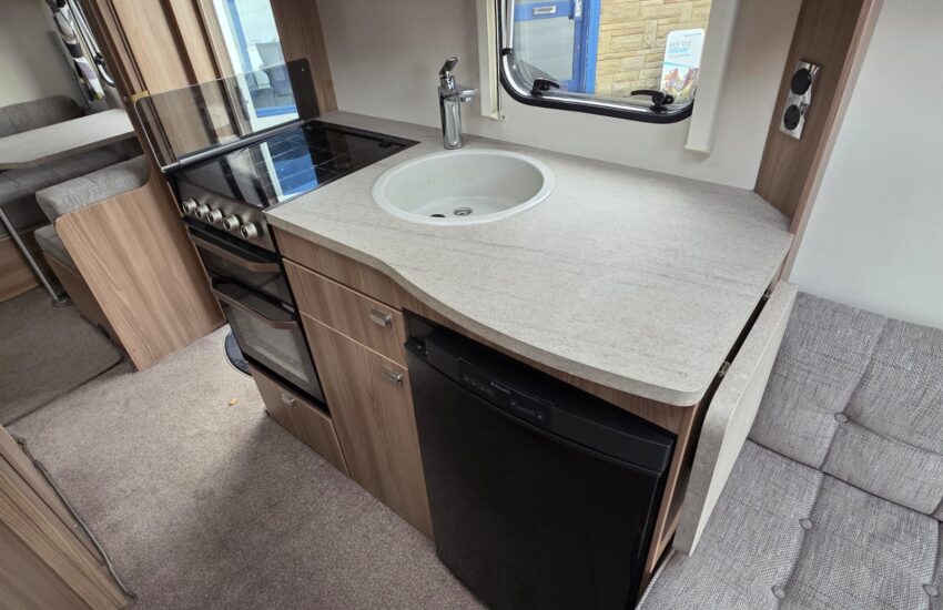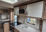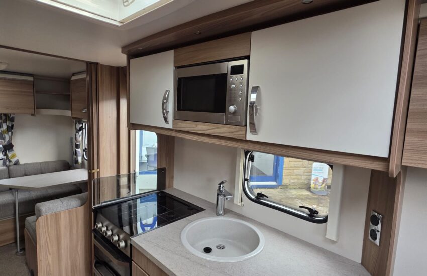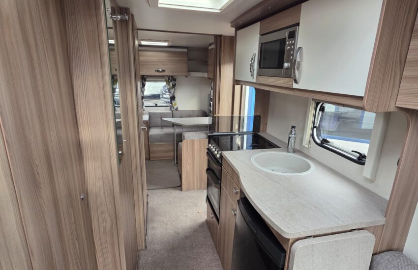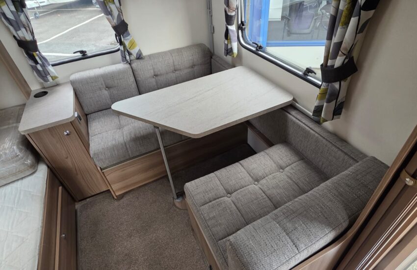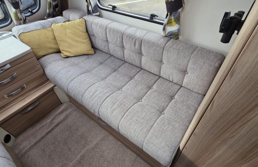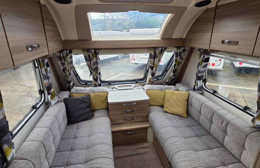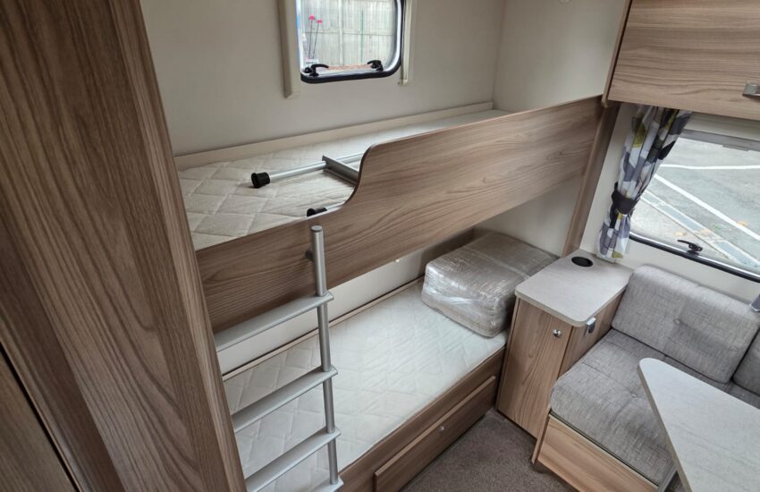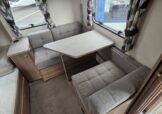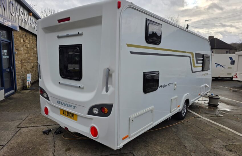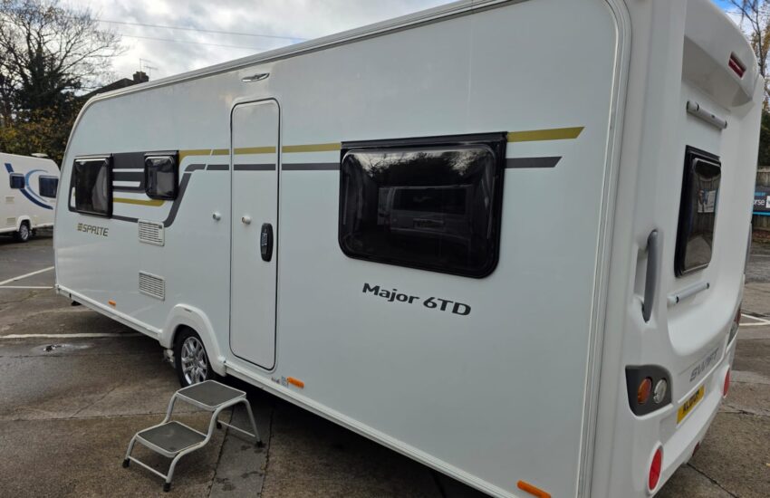 The 2017 Swift Sprite Major 6TD is a 6 berth touring caravan with a layout featuring a front lounge, a central kitchen and a rear dinette with bunk beds.