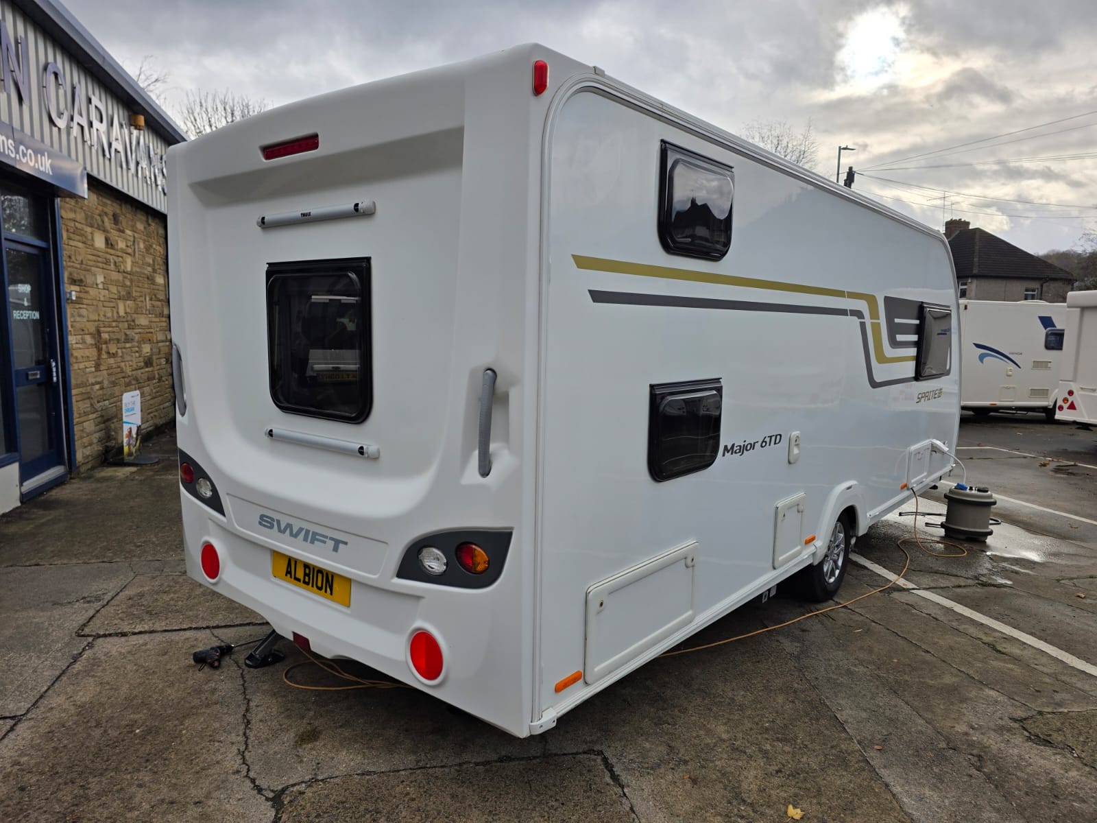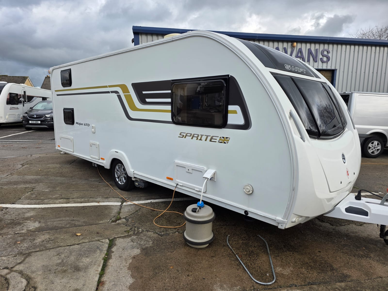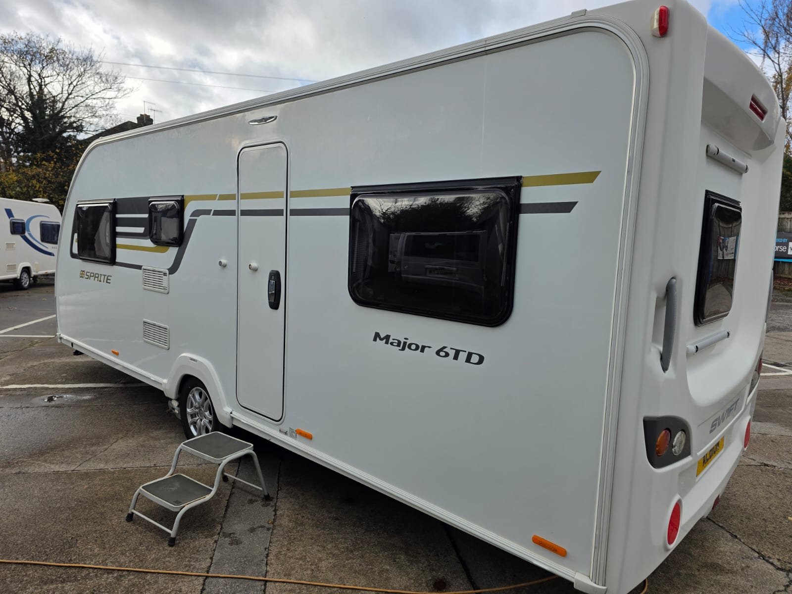 The 2017 Swift Sprite Major 6TD is a 6 berth touring caravan with a layout featuring a front lounge, a central kitchen and a rear dinette with bunk beds.