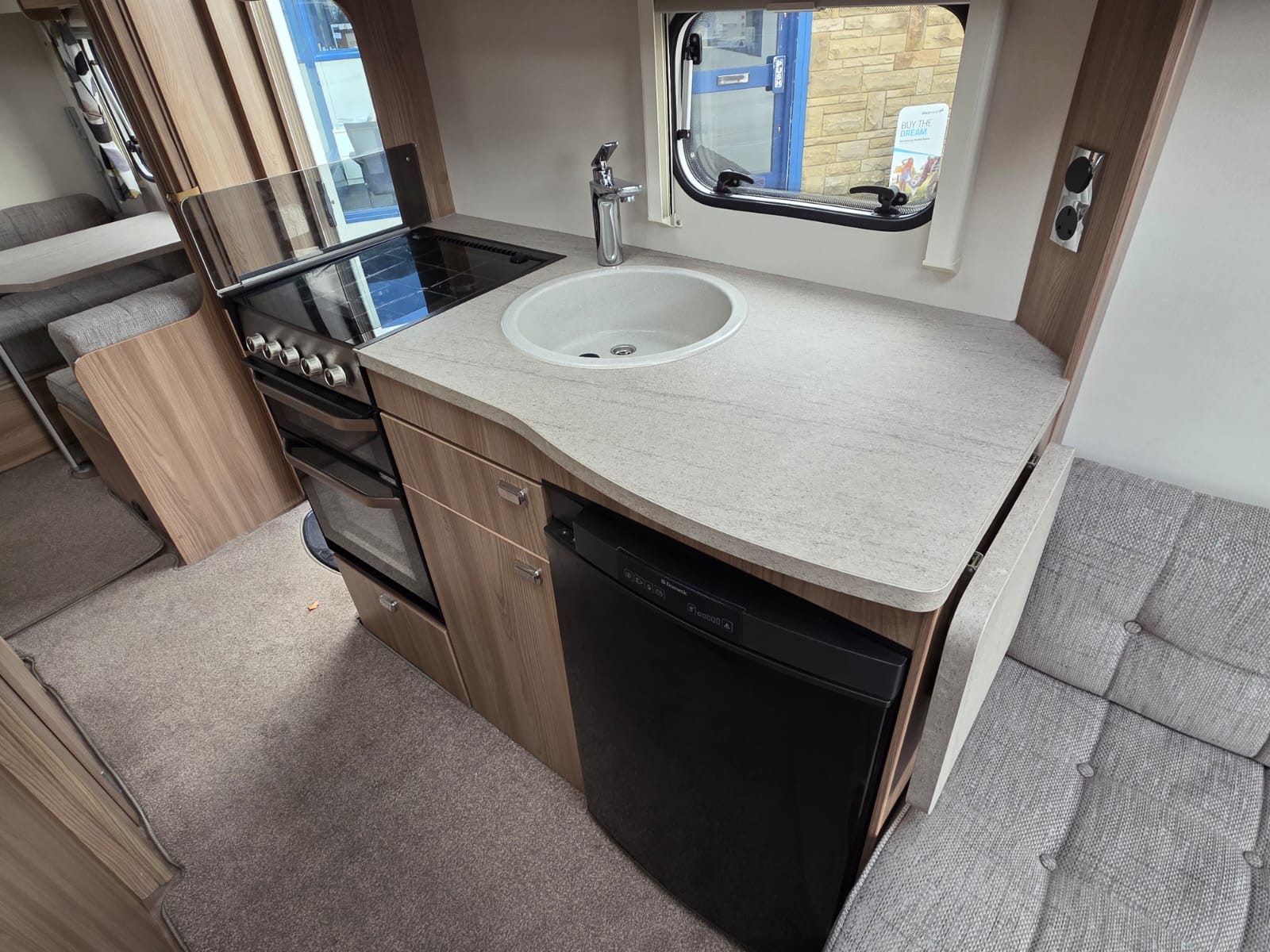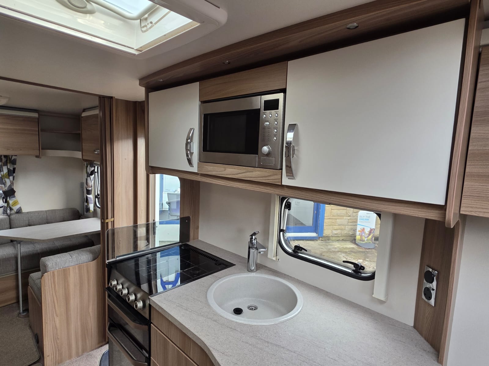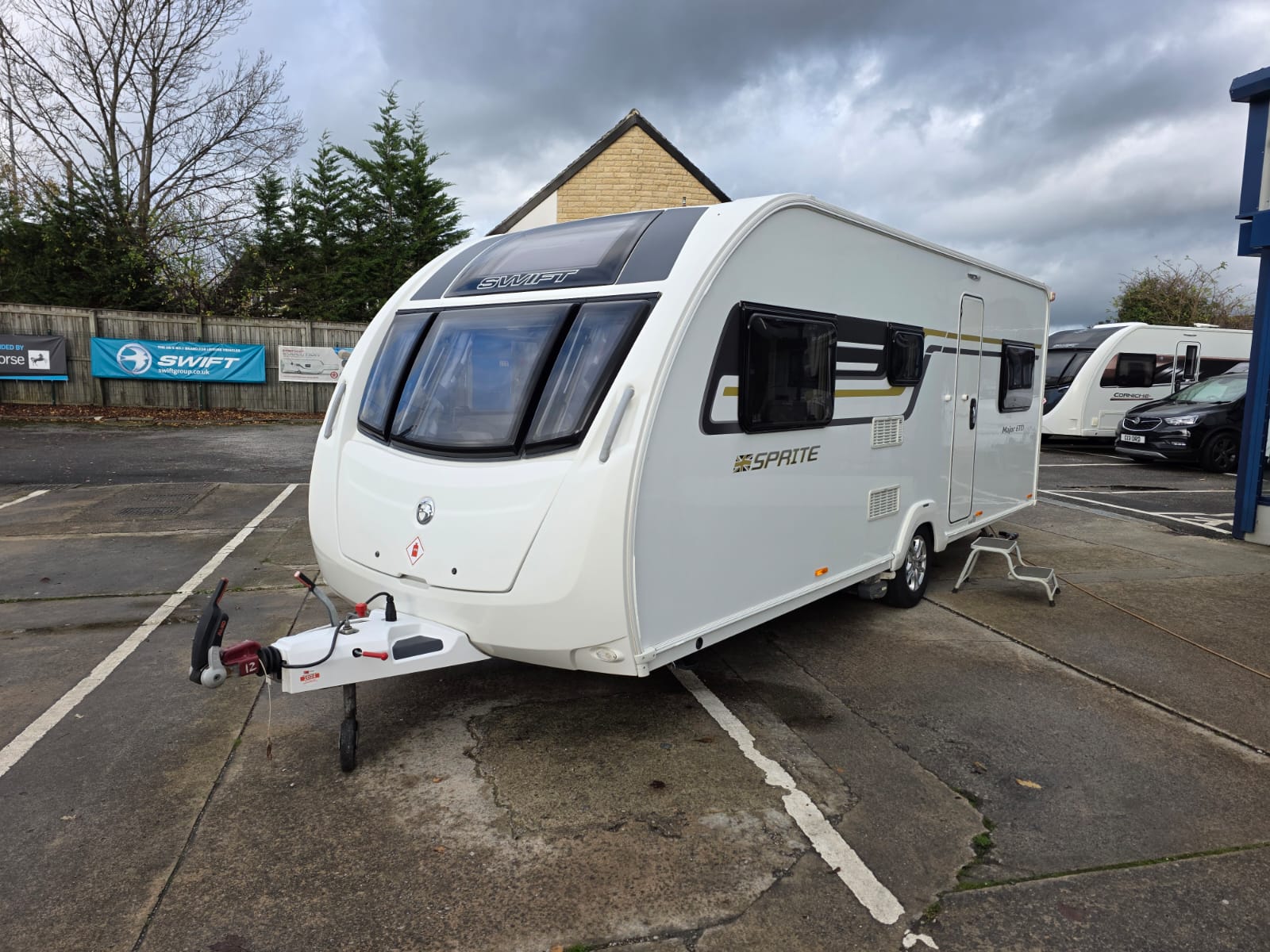 The 2017 Swift Sprite Major 6TD is a 6 berth touring caravan with a layout featuring a front lounge, a central kitchen and a rear dinette with bunk beds.