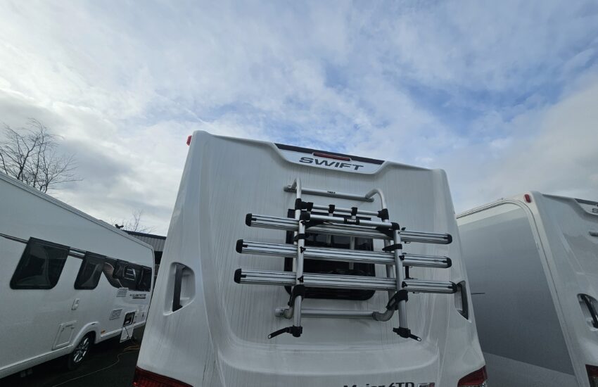 The Swift Sprite Major 6TD 2021 is a well-equipped, family-oriented caravan offering comfortable sleeping for six, practical living space with a rear bunk layout, and a decent spec of kitchen and bathroom facilities. It’s designed to be relatively light to tow and suitable for both short breaks and longer trips. A popular family-friendly caravan from Swift with a 6-berth layout fitted with bike rack fitted. Powrtouch Evolution motor mover included.